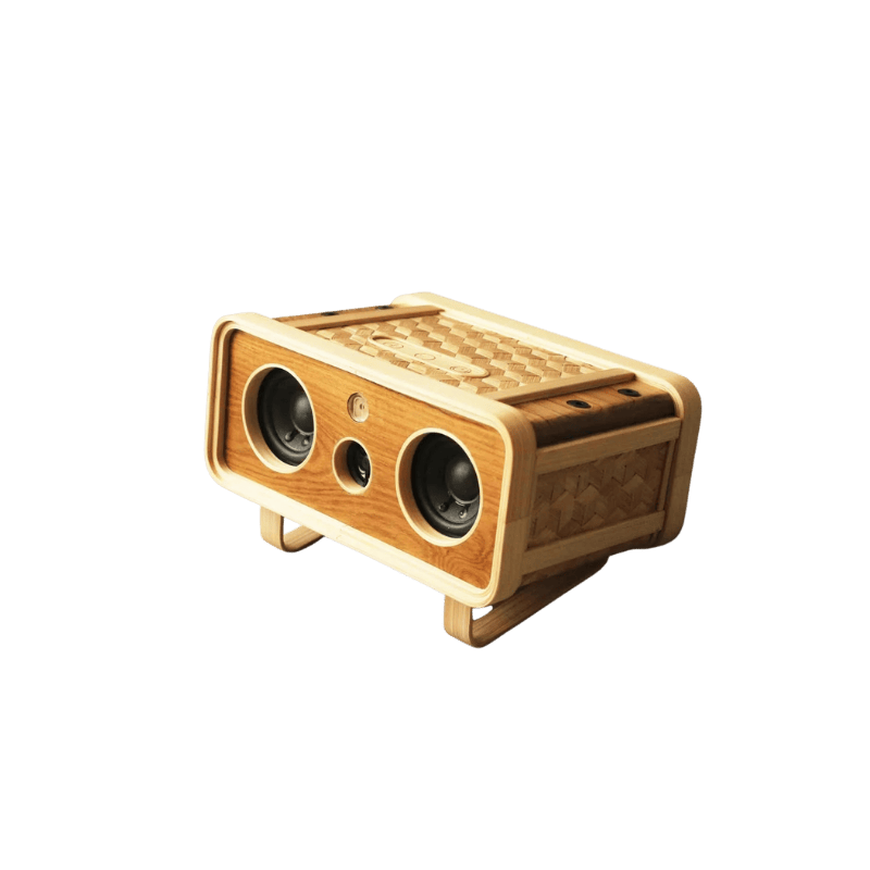 A compact bamboo Bluetooth speaker with a retro boxy silhouette, featuring dual front drivers and