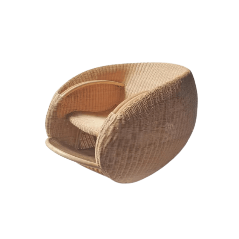 A sculptural rattan lounge chair with an organic, cocoon-like form that cradles the body. Handwoven
