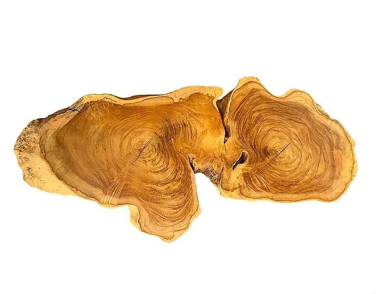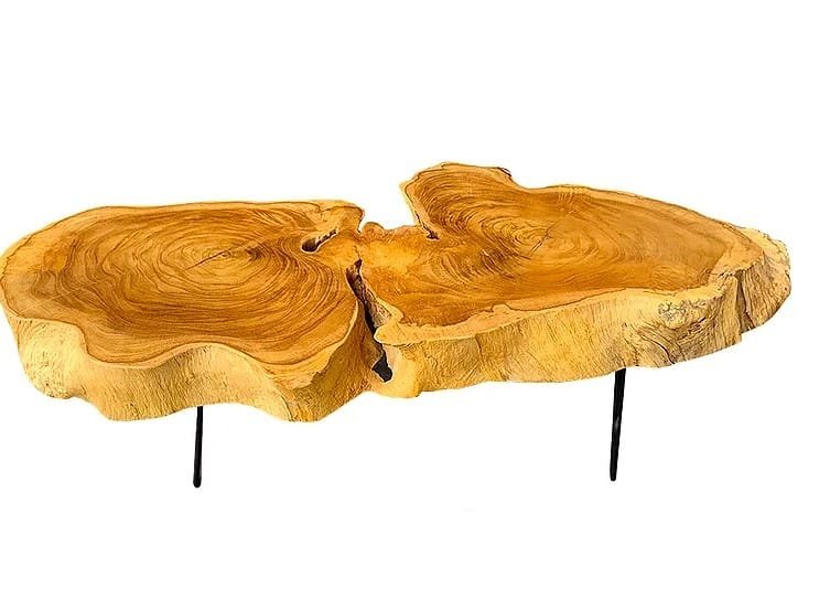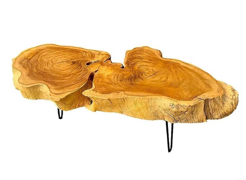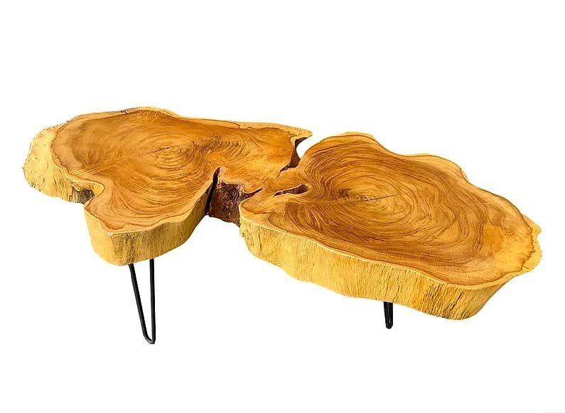 Live Edge Coffee Table Made from Lamtoro Gung (Giant Leucanea) Wood Solid Slab. For sale! This very unique and exotic coffee table is made from a Single Slab of Lamtoro Gung (Giant Leucanea) which is an extremely rare wood. Because it was created from a fallen Lamtoro Gung tree that is more than 90 years old. It takes so many years for this type of wood tree to grow. Although this is one of its branches, it is an extra hard wood and has so beautiful deep grain. From the type of tree and its very old age, it has so many cambium circles forming a very beautiful texture and pattern. The dimensions of this table are 28cm-112cm (11″- 44.1″) in diameter (live edge) x 40cm (15.7″) in height and the table top is 10cm (3.9″) in thickness, and 11.5 kilograms in weight. We finished the table top in a matte lacquer finish with dof and clear water based. So its natural beauty becomes very visible and clear. We custom made hair pin legs in solid steel and a matte black color. If you want taller and/or smaller, or different colour of hair pin leg, let us know. This product is perfect for the interior of your home, hotel, restaurant, cafe, or for some kind of gift for your family, colleagues, or special friends. Good design is for everyone. and solid wood has an almost perfect and exotic beauty.